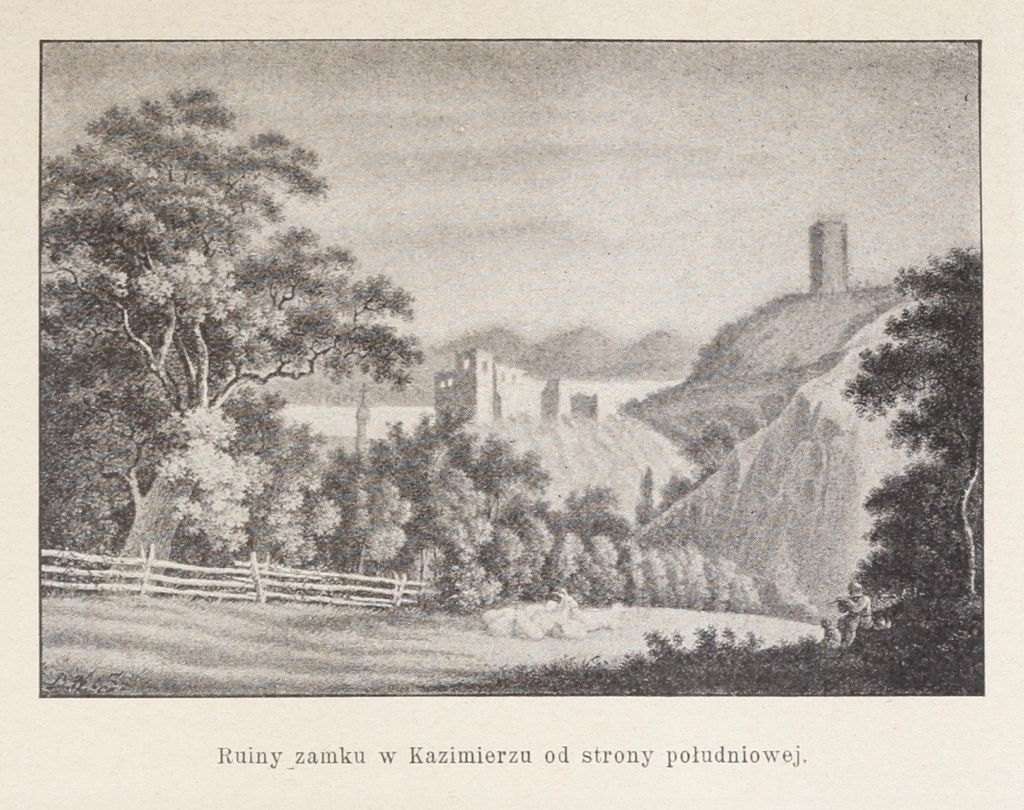 W jednym z pierwszych numerów Ziarna r. b. podaliśmy opis jednego z największych drzew Europy, znajdującego się w Grecyi a związanego z imieniem bohatera greckiej walki o niepodległość. Takie olbrzymie drzewa wzbudzają podziw. Ale nietylko obczyzna niemi się poszczycić może są i w naszym kraju drzewa prawdziwie olbrzymie, a wiek ich często sięga do 1,500, a nawet i więcej lat. Jednym z takich olbrzymów jest wspaniały i ogromny dąb znajdujący się w Kazimierzu nad Wisłą. Stoi on obecnie w polu, o kilkaset kroków od cmentarza kazimierzowskiego, w miejscu, gdzie podobno przed wiekami było cmentarzysko pogańskie. Dąb ten mający obwodu przeszło 26 stóp na wysokości piersi człowieka, główną swoją koronę już postradał, wraz z kilkoma bocznemi ogromnemi gałęziami uschła ona, jak się zdaje, wskutek pożaru. Zaprószony we wnętrzu olbrzyma ogień wypalił ogromną dziuplę. Pozostały jednak słój kambialny nie dał w zupełności uschnąć olbrzymowi, podtrzymując życie paru bocznych konarów, z których każdy oddzielnie mógłby być drzewem pierwszorzędnej wielkości. Ściany w wypalonej dziupli olbrzyma na wysokości kilkunastu stóp od ziemi wzmocnione są paru poprzecznemi belkami, a sama dziupla jest tak ogromną, że swobodnie może w niej pomieścić się kilka osób. Wielka szkoda, że ogień zniszczył główną masę drzewa, nie pozwalając mu rosnąć i rozwijać się w głównej swej części, t. j. w koronie. Według zapewnienia profesora von Branke (prof. puławskiego Instytutu agronomiczno-leśnego) dąb ten liczy około 1,500 lat. Przez ciąg tak długi swego życia niejednej rzeczy ten starzec był świadkiem, a w letnie noce szmerem swych liści może niejedną opowieść nam szepce. Nikt go jednak nie słucha i nikt nie rozumie, pastuszkowie tylko w dziupli jego mają schronienie przed deszczem, a przechodzień, mijając, uchyli kapelusza przed kapliczką z ołtarzykiem, przez pobożną rękę przybitą na piersiach olbrzyma.
