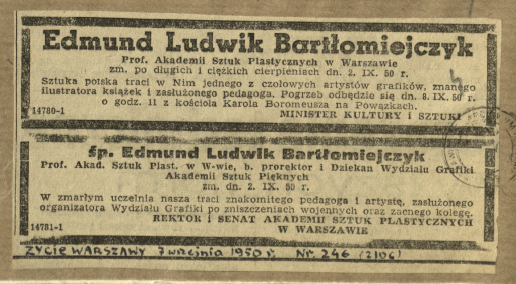 Rozwijał talent, poszukiwał własnych dróg i inspiracji, stając się z czasem jednym z najwybitniejszych polskich grafików pierwszej połowy XX wieku. W 1926 r. w warszawskiej Szkole Sztuk Pięknych powstała Pracownia Grafiki Użytkowej prowadzona przez Edmunda Bartłomiejczyka, lansującego ideę przenikania się dyscyplin. Bartłomiejczyk cieszył się opinią świetnego pedagoga i teoretyka sztuki, oddając się jednocześnie autorskiej twórczości, której szczególną formą były barwne, ręcznie kolorowane drzeworyty, w których łączył secesję z inspiracjami sztuką ludową i sakralną.